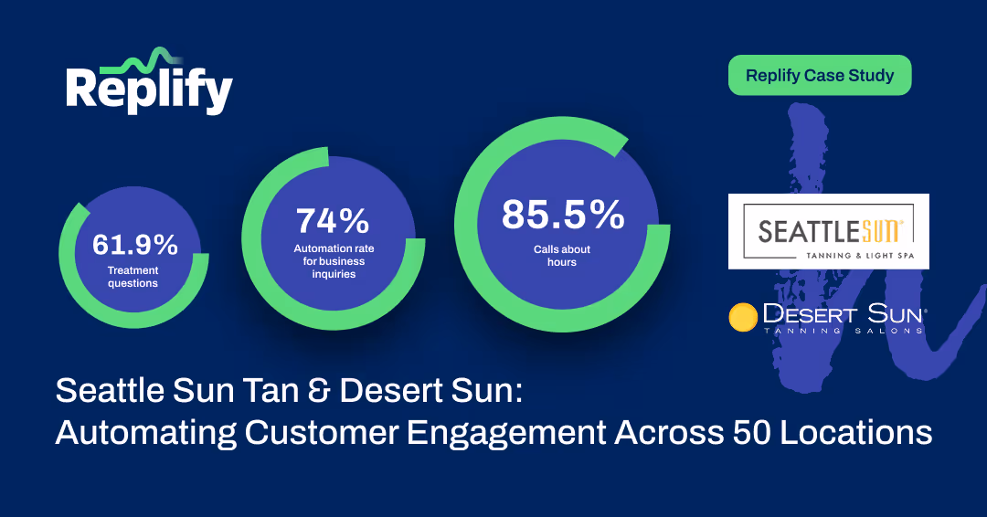 Seattle Sun Tan and Desert Sun, leading salon chains with over 50 locations, faced persistent challenges with high call volumes and repetitive customer questions. By deploying Replify’s AI-powered automation, they achieved a 74% automation rate for business inquiries, including 85.5% of calls about hours and 61.9% of treatment questions.